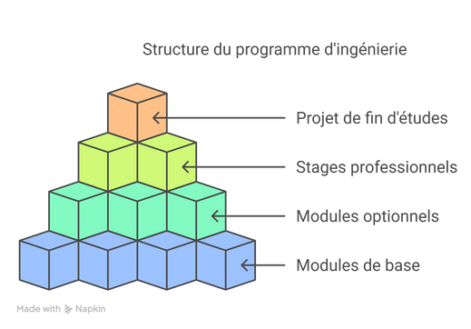 La formation est complétée par des stages professionnels obligatoires en première et deuxième année; en troisième année, elle inclut un projet de fin d’études à caractère professionnel sous forme d’un travail d’ingénierie encadré par au moins un enseignant. Les études sont organisées en unités d’enseignement ou modules. Les modules peuvent être regroupés en groupes de modules (GM) comme unités d’évaluation des connaissances.